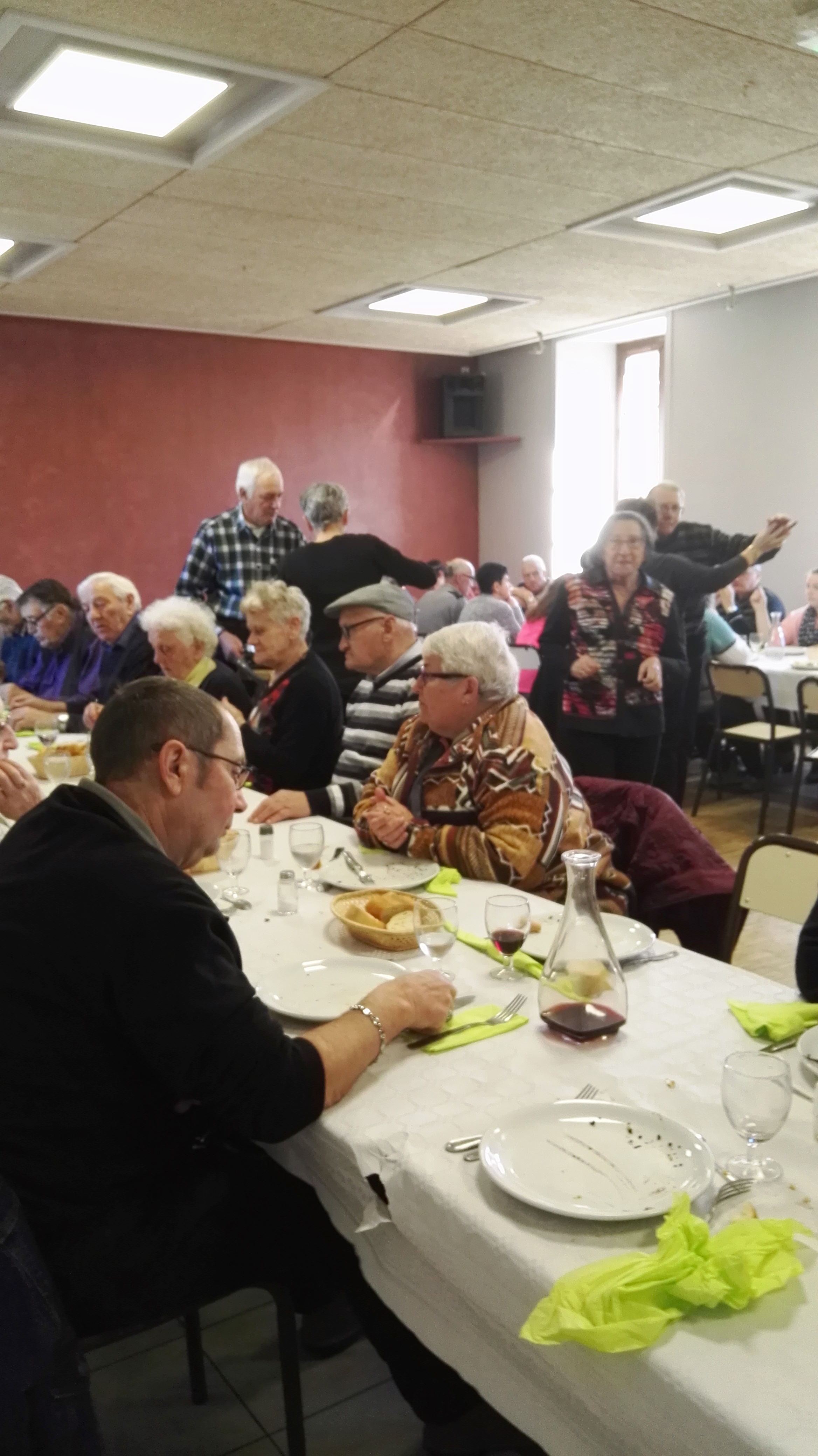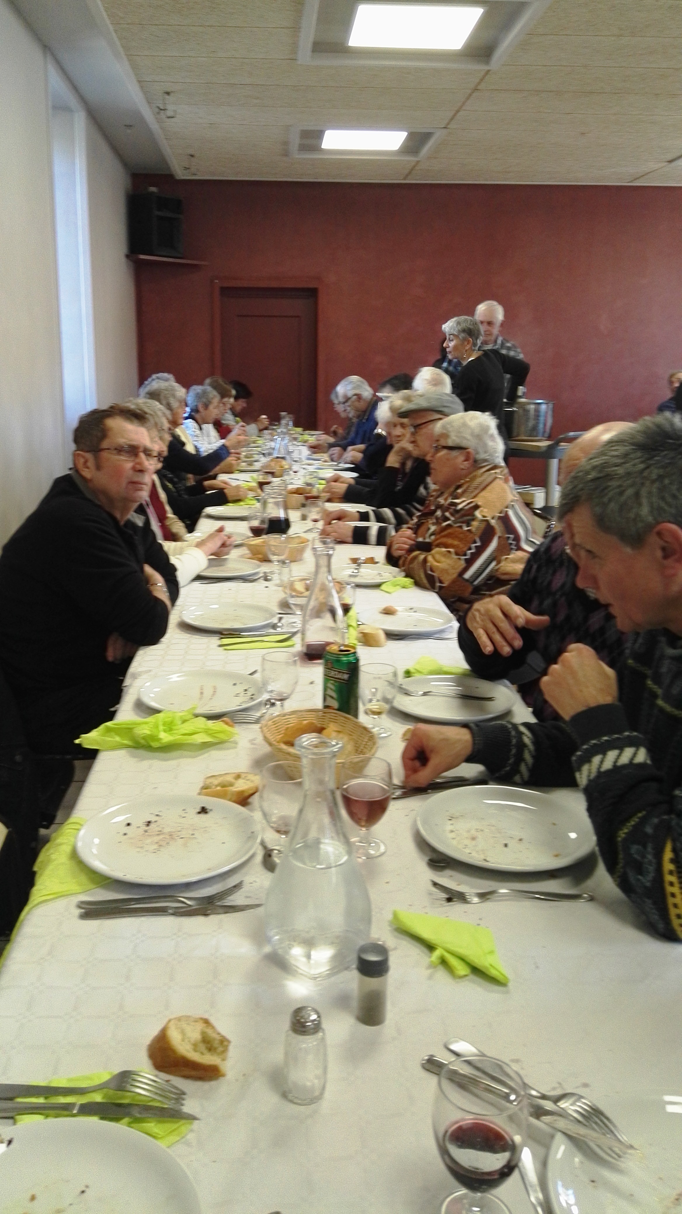 Le repas fut une réussite : 72 adultes et un enfant. Au menu d’abord le traditionnel « porchet », lard coupé sous la gorge du porc, et le pâté de tête, puis arrivèrent sans discontinuer les saucisses, boudins, moches et flèque. Le fromage du pays et une rafraichissante salade de fruits clôturèrent ce festin arrosé d’un bon vin.